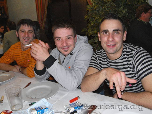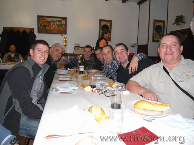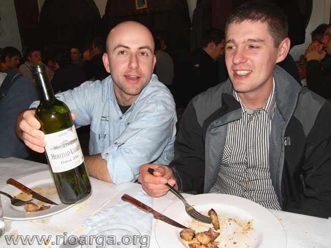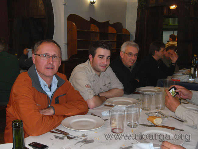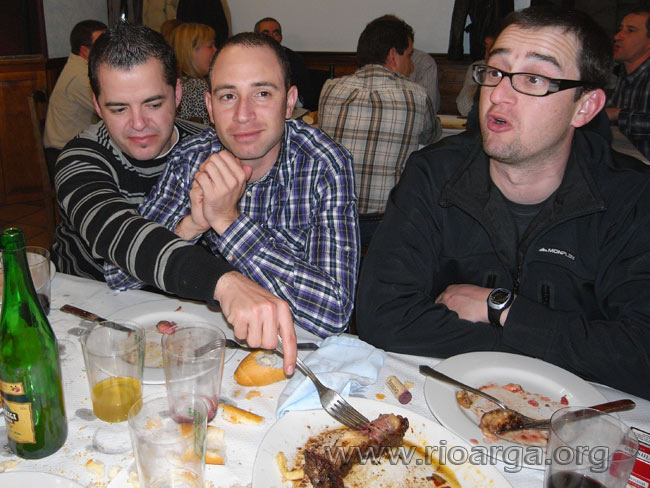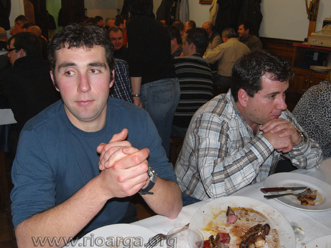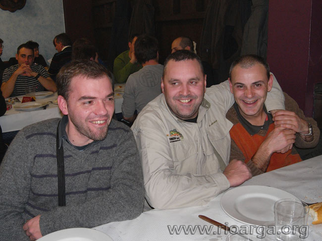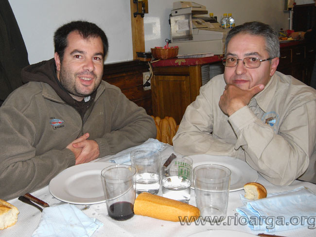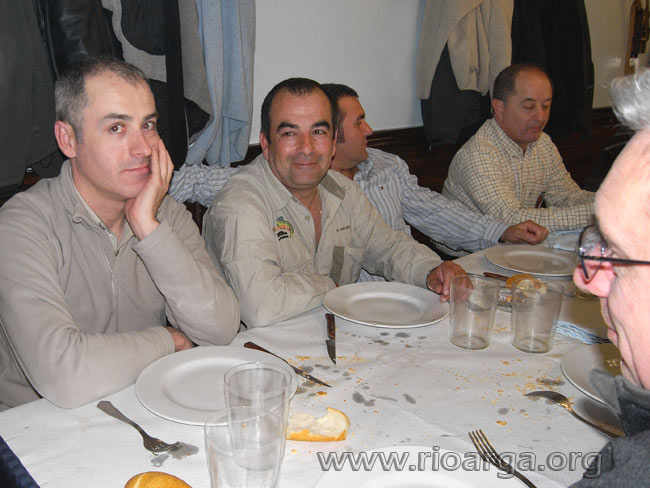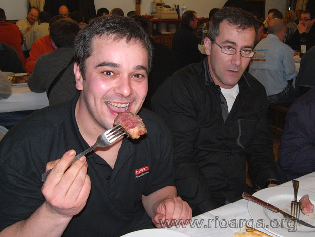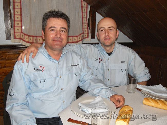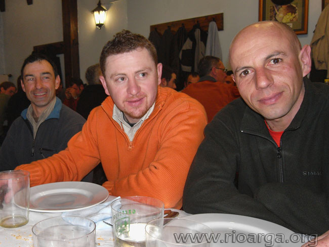 Hecho el sorteo de tramos, el concurso dio comienzo a las nueve horas del viernes, en mangas de hora y media, en tramos con abundantes arco-iris pero con un caudal algo alto y aguas claras, a no más de 7.5 grados (la semana anterior bajaba a 4.5º debido a las nevadas). Las circunstancias del río y la ausencia de la piscifactoría, recientemente cerrada, fueron determinantes ya desde esta primera manga: algunos tramos acusaron la menor densidad de peces nuevos (las iris viejas y las comunes se movieron poco). En cambio la escuela de pesca, el libre sin muerte y otros tramos clásicos mostraron la gran cantidad de peces con que cuenta el acotado. Durante el día cayeron fuertes chaparrones que harían subir el río durante la noche, pero la organización había encargado buen tiempo para la comida, consistente en un lunch con caldico caliente incluido, en el merendero del Centro de Visitantes y Escuela de Pesca del Leizán. Para cenar, chuletón y sidra, como no podía ser de otra forma.