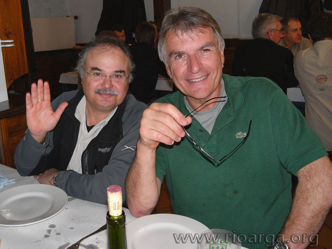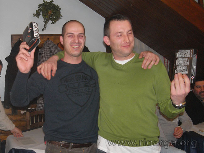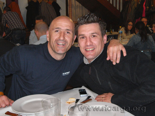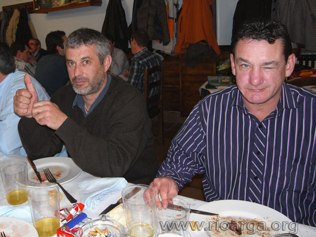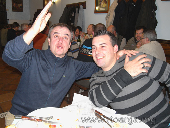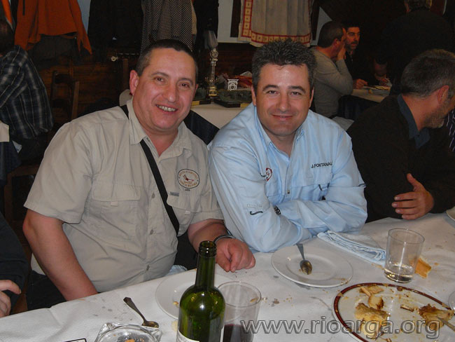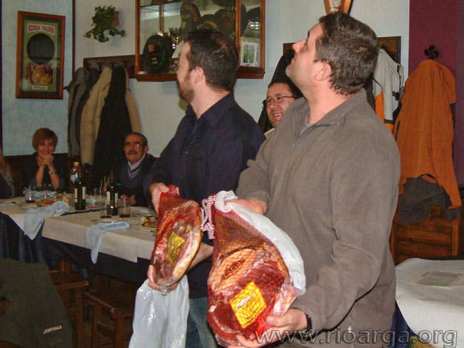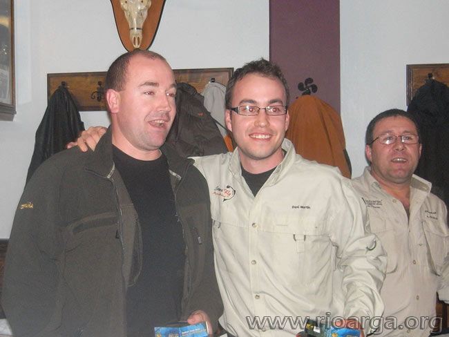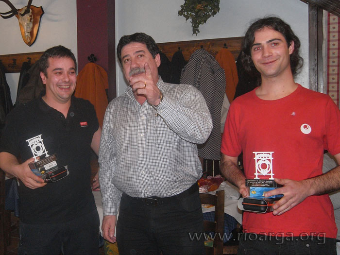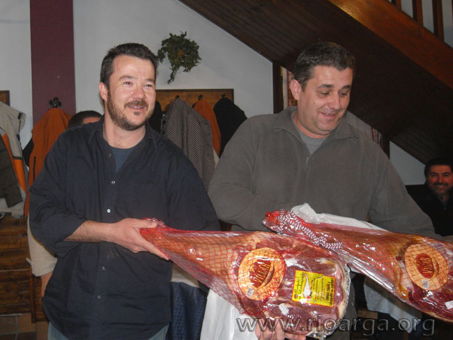 Sin embargo el puesto más disputado sería el último, premiado con sendas paletillas de Jabugo para los miembros de la pareja peor clasificada. Durante las primeras mangas varios equipos pugnaron por el preciado trofeo, no obstante la regularidad obtuvo su justo premio y Toño Goñi y Pepe Weigan (sí!!! Los de la Tele!!!!) lograron clasificarse en último lugar a gran distancia de sus inmediatos seguidores. Siempre nos quedará la duda de si sus tramos fueron tan malos, lo tenían planeado desde el principio o realmente sólo se saben la teoría y de pescar "na´de na!!!".