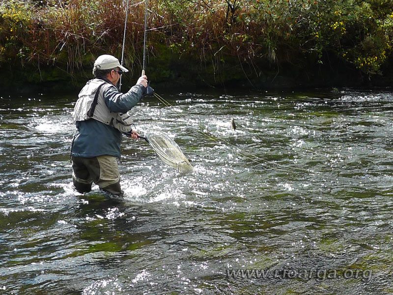 Pablo Castro también nos dio una lección (¡qué importante es saber competir con calma!): estuvo sus dos horas de manga hablando con nosotros de aquel viaje que hicimos al Test inglés y otras batallas y todavía tuvo tiempo de sacar una docena de truchas de medida, otras tantas pequeñas y sabe dios cuantos escallus. Era sorprendente ver el manejo que tiene llevando dos cañas, una metida en el váder, intercambiándolas sin perder segundo hasta el punto de que llegamos a pensar que acabaría lanzando y capturando con ambas cañas al mismo tiempo.