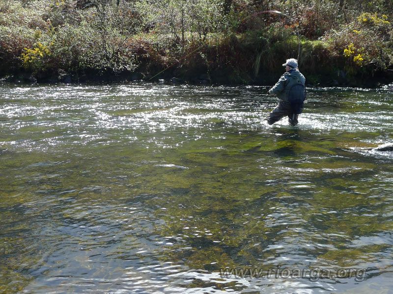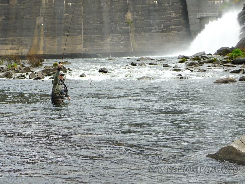 Controlar a Matilla también fue más que interesante, muchos afirman que pescar con ninfa al hilo "es como pescar a cebo y no tiene ningún secreto". Me gustaría que esos mismos intentaran lanzar, colocar y controlar la deriva de dos ninfítas diminutas a quince metros y lograran enterarse de las picadas. Matilla hizo todo eso y también metió los peces en la tomadera, lanzando limpiamente a distancia y con pulcritud, tan fino como si estuviera pescando a seca en una de sus badinas de Villamor y con un hilo tan fino que no se veía ni el nudo. Le vi desde lejos pelear con un buen bicho en la salida del colchón de la presa, durante varios minutos, pero finalmente lo perdió. Xanti que estaba a su lado me confirmaría que sin duda esa podía haber sido la pieza mayor del concurso ya que rondaba los 40 centímetros.
