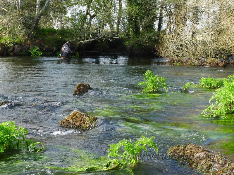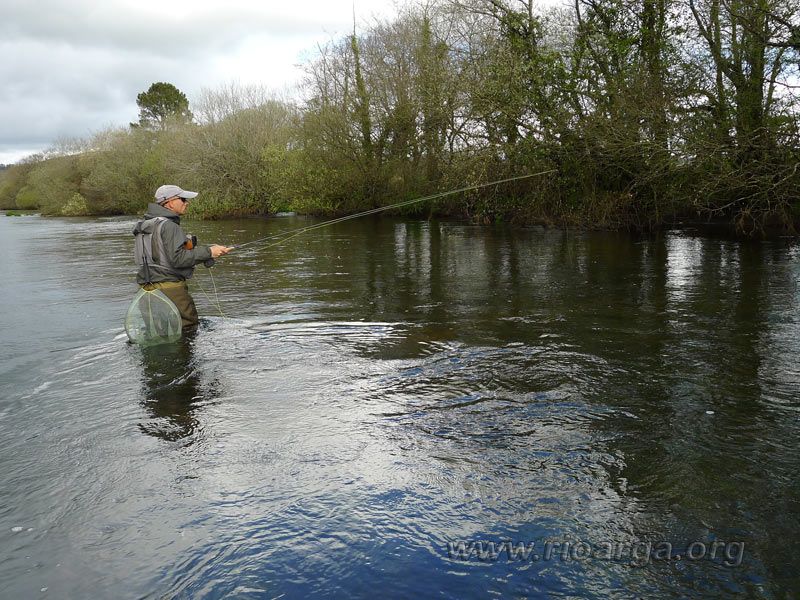 También controlamos a Kuki, uno de los que lleva más campeonatos a sus espaldas en Galicia y, como experto en la materia, me refiero a los ríos gallegos típicos, enmarañados y oscuros, nos enseñó dónde se esconden las a veces puñeteras truchas gallegas. Con una caña corta, de línea 3, se metió bajo la palera que cubría un gancho (en León significa brazo de río) de apenas unos metros para sacarle dos truchas de buen tamaño, pareciendo más un setter becadero en un zarzal que un pescador de mosca. Cuando le quedaban unos minutos para terminar la manga me obligó a volver a aquel agujero, madriguera de nutrias, para todavía sacarle una tercera y completar una buena plica.