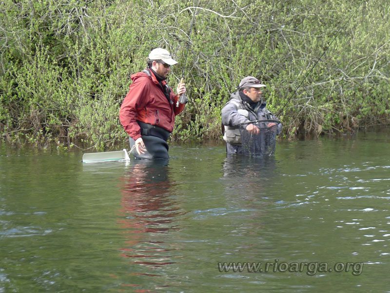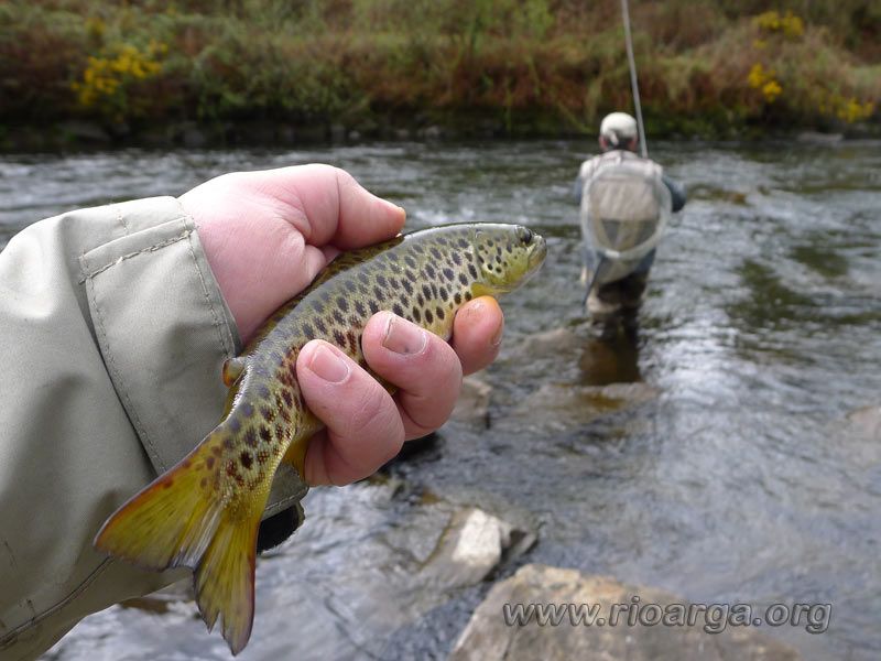 Estábamos advertidos pero aún y todo me pareció increíble. Al entregar a mi control una trucha de unos 25 centímetros, enseguida exclamó “¡Está marcada! ¡Está marcada!” Pudiendo comprobar que había pescado mi primera trucha matriculada. No sé en que acabará esto… Dentro de mi tomadera se revolvía un pez en cuyo opérculo, bajo la mucosa, como si fuera su propia piel, había un rectángulo amarillo de unos milímetros donde podía leerse “A-94”. ¡ALUCINANTE! No era un “tag” de los que colocan a algunos salmones en la dorsal o algo parecido, se veía bajo la piel como un tatuaje. ¡Si en aquel momento se le hubieran encendido dos leds rojos en los ojos no me hubiera sorprendido más! En realidad se trataba de un estudio que están realizando sobre los desplazamientos de las truchas y su comportamiento para el que este concurso ha sido de gran ayuda aportando todos los datos de capturas por tramos y horas así como de ejemplares marcados. También han hecho análisis de algunos ejemplares grandes que aparecieron muertos siendo una bacteria proveniente de los purines la probable responsable.