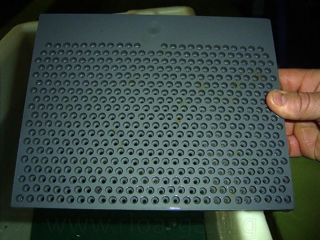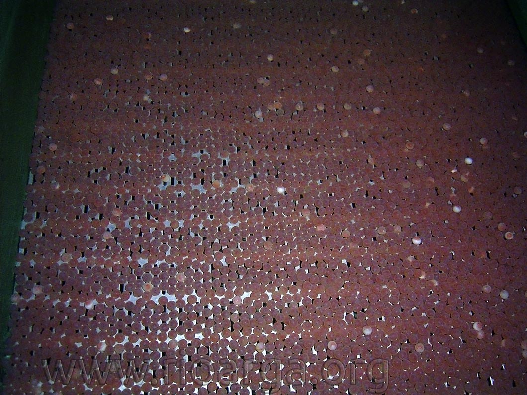 G. Esas ya no valen, por un motivo u otro siempre salen con fallo, el 15 o 20%, que os he comentado, estas podemos hacer lo que queramos y en cuanto se arrimen a los 500 grados, se vuelven a limpiar, porque se quita todo y empezamos a poner en las pilas 10.000 0 12.000 a nacer, en una pila de estas puedes embrionar 200.000 huevas, siempre van por tandas, tengo numerados los bastidores, luego a la hora del nacimiento, ya mas de 1.500 alevines por metro cuadrado ya no ponemos.