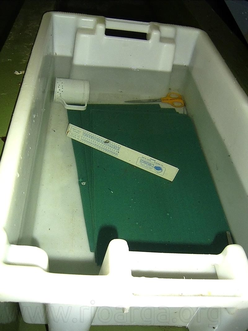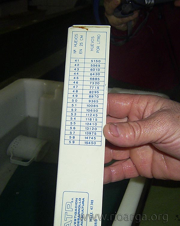 G. Con muy poquita corriente de agua, luego lo que hago es ponerles un poco tesamol, para cerrarlo herméticamente, y refresquen el bastidor, que esta preparado como veis con una patica, como veis por debajo pasa el agua y luego bota por la parte de atrás y a otro bastidor, el agua hace un efecto de ola, esto es salmón, como veis el color es (risas) salmón.R.A.- ¿Como se repuebla con la hueva el río, se pone directamente la hueva en el río?
