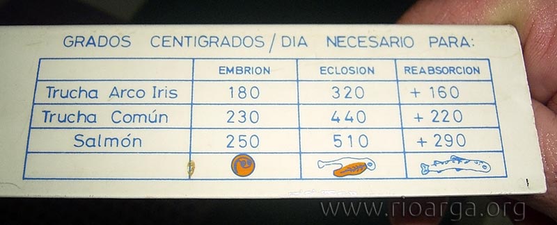 G. Imitando un poco la madre naturaleza, que es debajo de las graveras, hasta que aparezca el embrión, que aparece a los 250 grados de temperatura (sumando la temperatura media diaria) imaginaros una temperatura media de 10 grados por 25 días 250 grados, aquí es agua de río y depende mucho si nieva, hiela etc. la media mas o menos suelen ser entre 30 o 35 día.R.A.- Para conseguir que eclosionen las huevas.