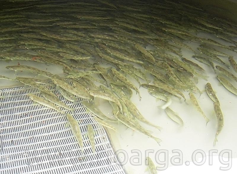 G. De 4 a 6 centímetros , una vez que empiezan a comer es un animal que crece rápido, de la partida de alevines que tengamos unos 8.000 ó 10.000 los guardamos para esguines, son esguines cuando se preparan cara al mar, cuando ya están esmornificado y tal, esos a parte de la aleta adiposa les metemos un microchip con un código binario en el hueso de la nariz, eso lo hacemos en febrero,( ahora os enseñare los alevines del año pasado), unos maduran o esmornifican en el río, desde junio hasta febrero o marzo del año siguiente y otros dentro de la piscifactoría, mas o menos hacemos este trabajo para saber que repoblación nos da los mejores resultados.