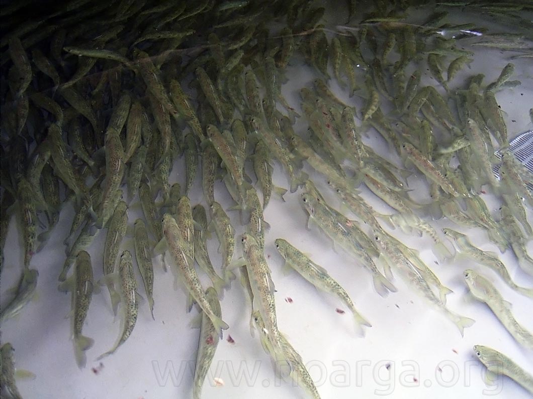 G. El resto, hay que decirlo que no sacamos el 100%, por ejemplo de 100.000 huevas puestas para nacer mínimo el 85% los sacamos, ósea 85.000 saldrían, 10.000 los dejaríamos en las instalaciones para esguines y otros 75.000 se repoblarían en el río, harían su esmornificación en estado totalmente natural y en la primavera en bandadas bajarían al mar, los que se quedan aquí los marcamos y los echamos directamente en el río Bidasoa el la zona mas baja.